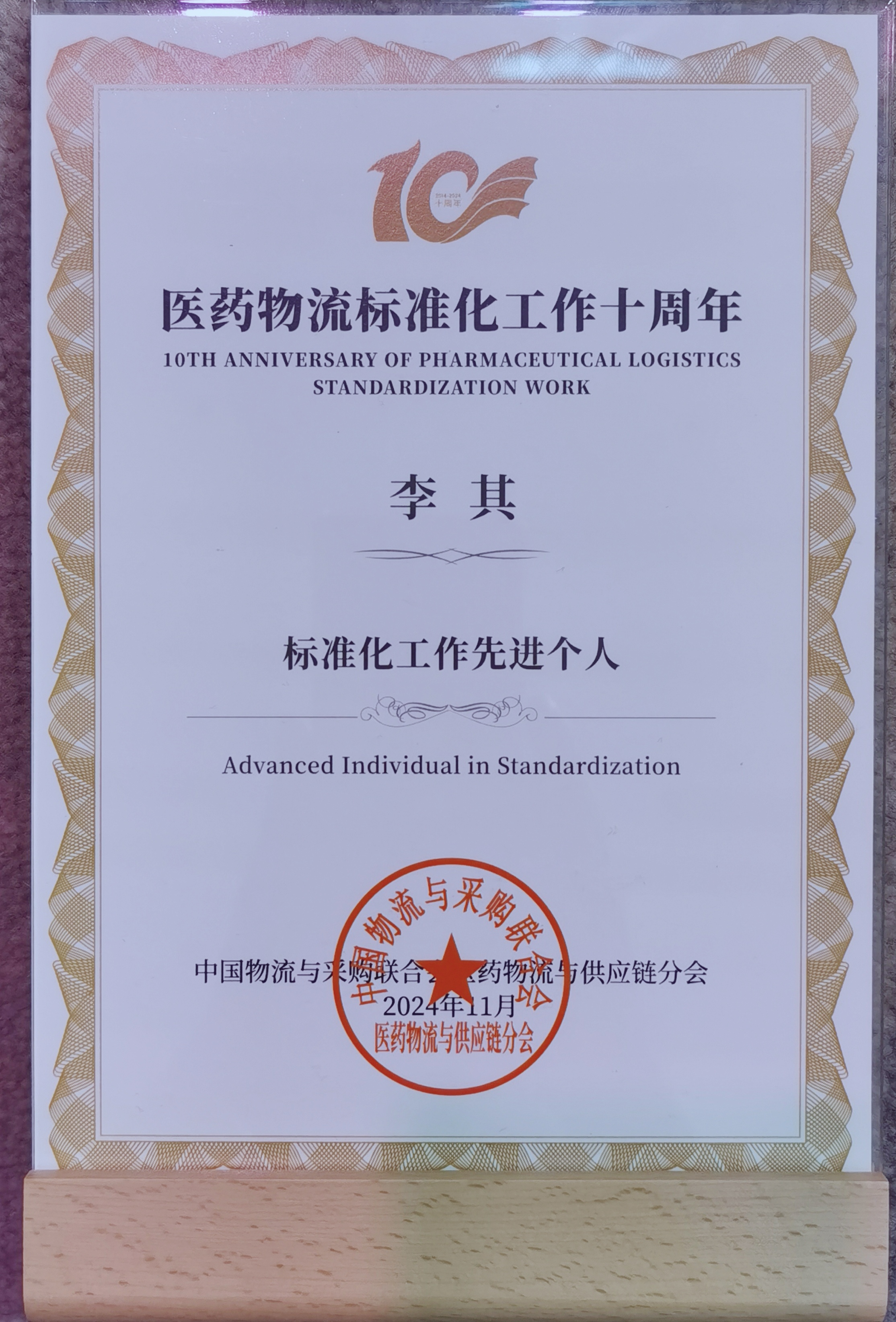 2024年11月由中國物流與采購聯(lián)合會(huì)醫(yī)藥物流分會(huì)征集的關(guān)于藥品物流標(biāo)準(zhǔn)化先進(jìn)個(gè)人和先進(jìn)單位評(píng)選活動(dòng)中,五洲醫(yī)藥榮獲“標(biāo)準(zhǔn)化工作先進(jìn)單位”榮譽(yù)稱號(hào),李其同志榮獲“標(biāo)準(zhǔn)化工作先進(jìn)個(gè)人”榮譽(yù)稱號(hào)。